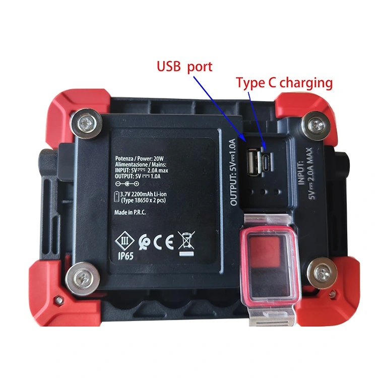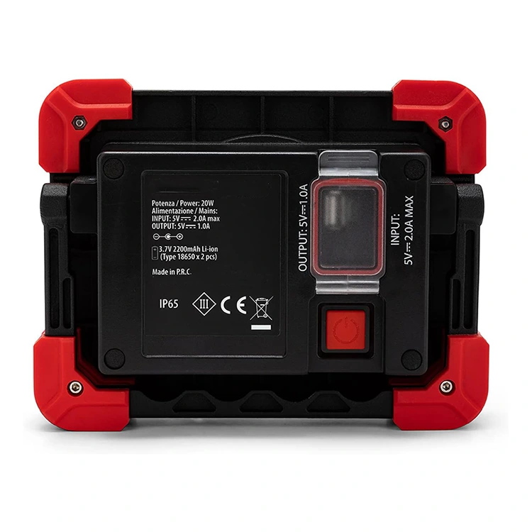 ไฟซังอลูมิเนียมสำหรับทำงานขนาด 1800lm ขนาด 20 วัตต์ใช้พลังงานจากแบตเตอรี่ลิเธียมแบบชาร์จไฟได้ 18650 จำนวน 2 ก้อน ซึ่งสามารถใช้งานได้นานหลังจากชาร์จหนึ่งครั้ง และยังได้รับการออกแบบให้มีสวิตช์แยกกันเพื่อควบคุมการเปิดและปิด ดังนั้นจึงไม่จำเป็นต้องเสียบปลั๊กตลอดเวลา ยิ่งไปกว่านั้น มันยังทำหน้าที่เป็นธนาคารพลังงานได้ในกรณีฉุกเฉิน เมื่อโทรศัพท์ของคุณแบตเตอรี่หมดและคุณไม่สามารถหาปลั๊กไฟได้ เพียงแค่เสียบปลั๊กก็สามารถให้ความช่วยเหลือได้ชั่วคราว ฟีเจอร์นี้ใช้งานได้จริง